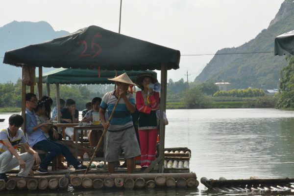 我們一行人乘坐幾條竹筏,逆流而上。隨行的還有一位壯族姑娘,扮演現代版的劉三姐與我們大家對歌。她歌如夜鶯,人若桃花,熱情好客,并且為我們解說當地的民俗風情。在對歌的過程中,壯族姑娘站在船頭向大家拋繡球,方佛我們又回到了當年阿牛哥與劉三姐的世界。有些人從艄公手里接過長蒿,向青草更清處漫溯。然而也有人在原地打轉,還不停地碰撞他人竹筏。