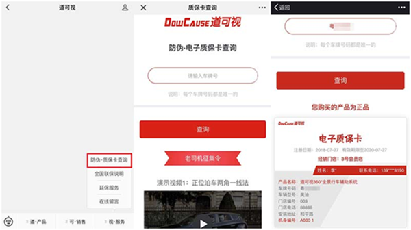 通過電子質(zhì)???,用戶可以免費享受2年的質(zhì)保和全國聯(lián)保服務(wù);可以隨時查詢產(chǎn)品的售后期限和相關(guān)售后政策;可以查詢到道可視分布全國的銷售網(wǎng)絡(luò);可以查詢到所在城市、地區(qū)的全國聯(lián)保門店,方便就近選擇售后門店;可以在線聯(lián)系官方客服,預(yù)約售后時間和地點。