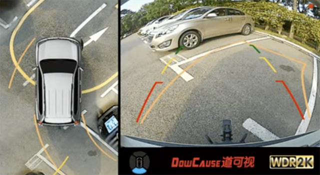 道可視360°全景通過“倒車入庫模式”,同時(shí)顯示倒車場景下的鳥瞰圖以及實(shí)時(shí)的后視影像,結(jié)合可跟隨方向盤方向而轉(zhuǎn)動的精準(zhǔn)倒車軌跡線,精準(zhǔn)的計(jì)算出行車軌跡(誤差小于3CM),幫助駕駛員準(zhǔn)確、安全、平穩(wěn)的倒車入庫。